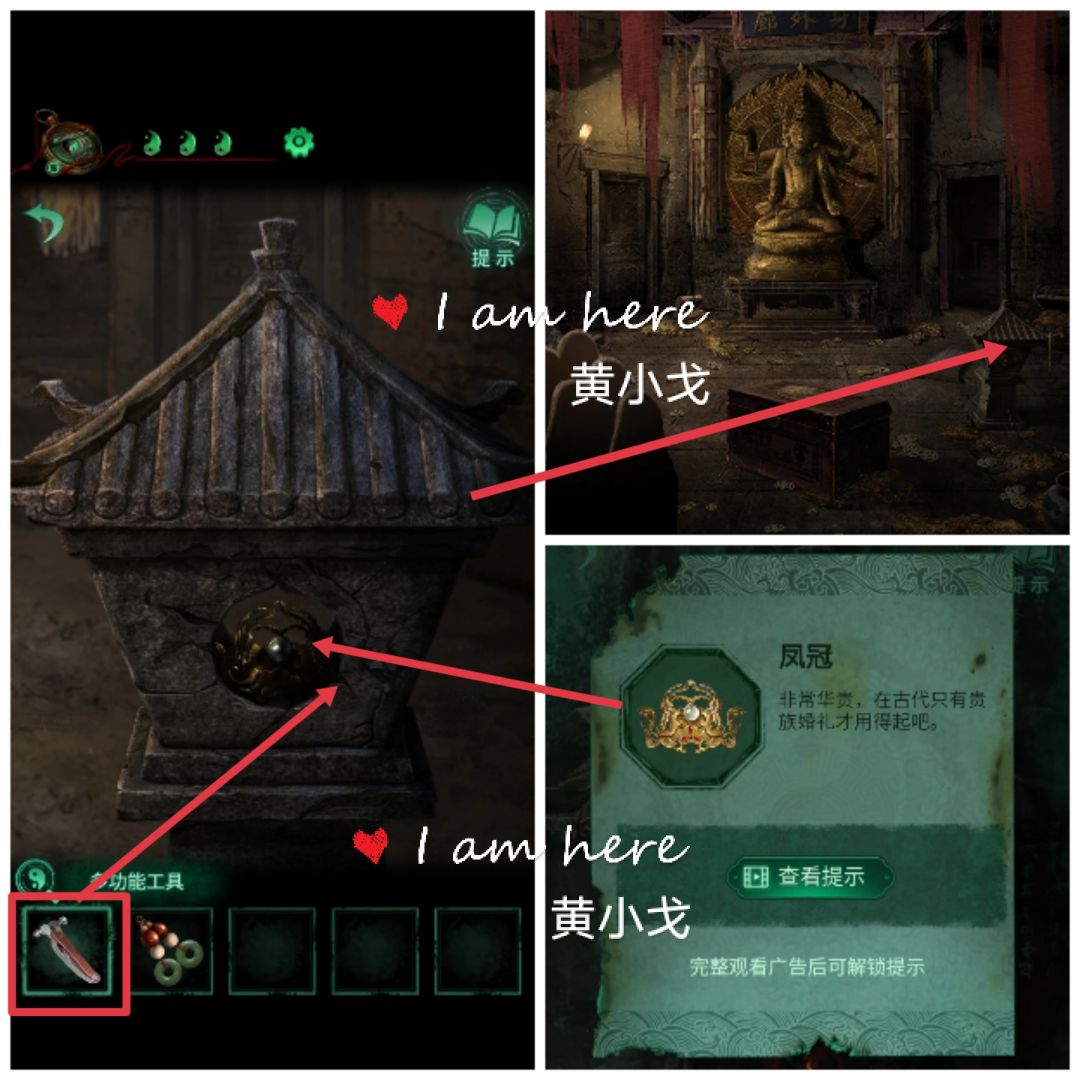 21.(男主视角)(身外廊)点击地上的石灯,用【多功能工具】敲石灯,获得【凤冠】