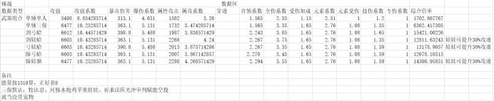 你看起来木攻系数很高,然而木攻的稀释也高。根据上面的武器搭配表格,我们来算一下稀释情况。