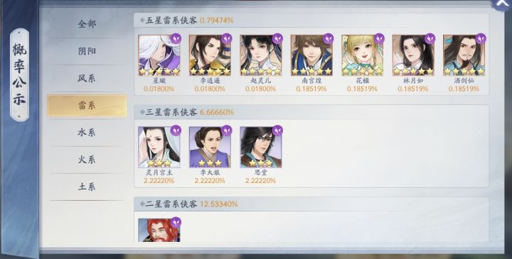 首先游戏的5星侠客分普通侠客和稀有侠客,如图抽卡概率公示里左边三个概率为0.018%的侠客为稀有侠客(星璇,李逍遥、赵灵儿),右边四个概率为0.185%的侠客为普通侠客(南宫煌、花楹、林月如,酒剑仙)。