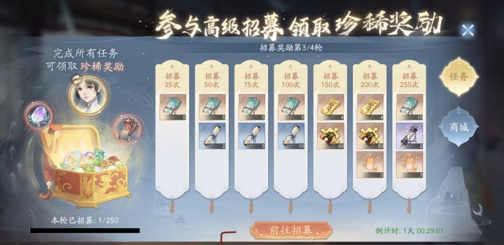 每两周的幸运招募活动250抽指定获得如图,稀有侠客自选箱(新安当等各种活动获,通关试炼等渠道),抽卡和碎片合成概率极低,除非欧皇否则几乎嫖不到自己想要的。