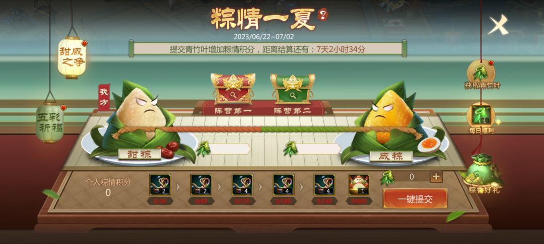 甜咸之争胜负已分,该阶段可领取己方阵营对应的宝箱奖励,此时提交青竹叶只增加个人粽情积分