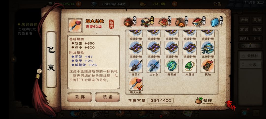 洛阳惠泉(2.39)再遇小孟,她套近乎,20两买走了,俺花3000元宝的巨弓。对话后(0.39)进入云梦村。