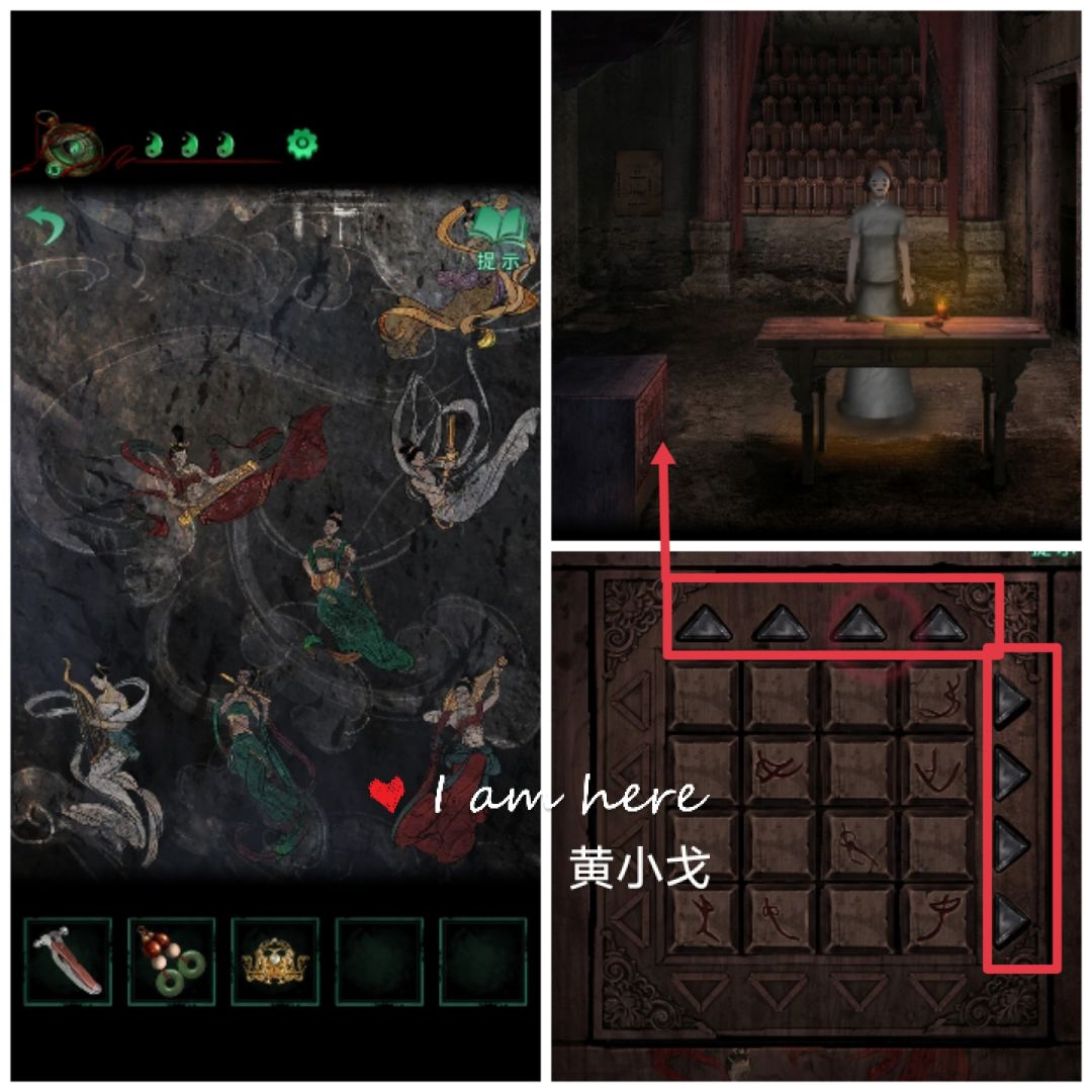 15.(男主视角)(百祭轩)(男主先进到身外廊再切换女主视角点击石像切换门)点击左边柜子,根据壁画上七仙女的姿势和位置,通过按钮调整木块的位置