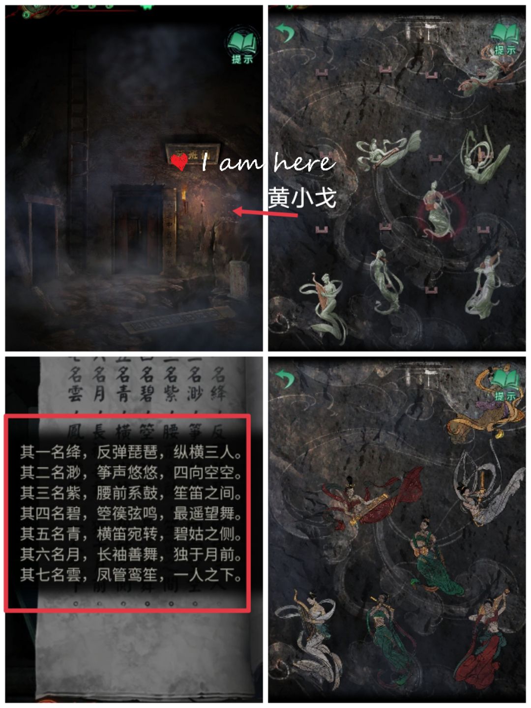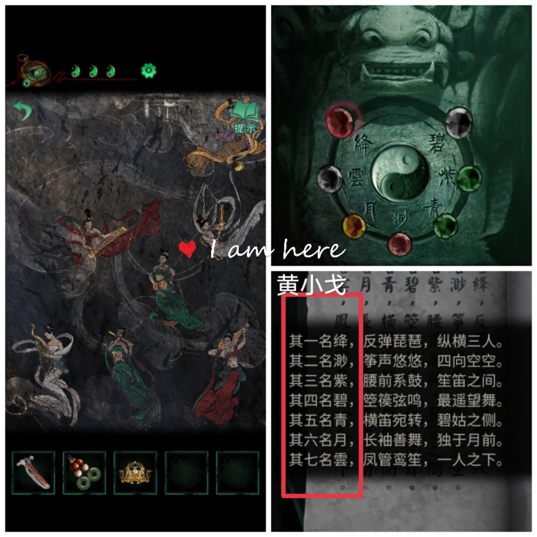 8.(女主视角)点击石像,根据七仙女壁画和《六转妙法录》上的线索调整对应的名字和颜色(碧-灰、紫-绿、青-绿、渺-红、月-黄、云-灰、绛-红)