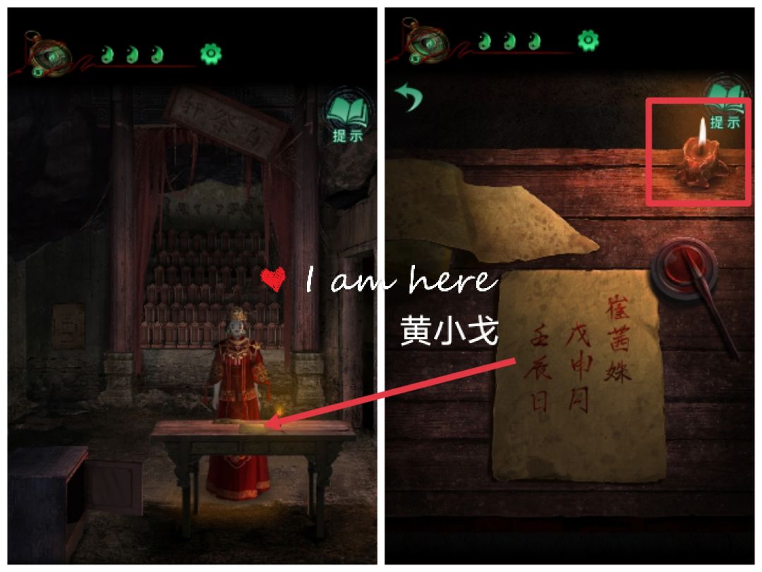 20.点击桌子上的笔,触发剧情,写下名字,点击桌上的蜡烛焚烧纸人,暗门出现