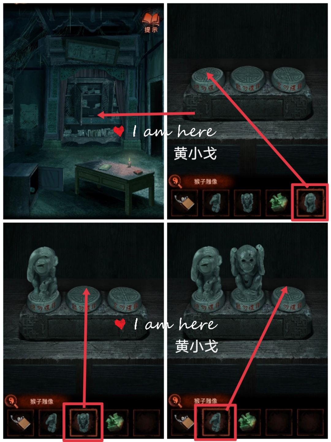 13.(千书斋)点击书架,按照石座上的说明(非礼勿视、非礼勿听、非礼勿言)和雕像的姿势,把【猴子雕像】放到正确的石座上