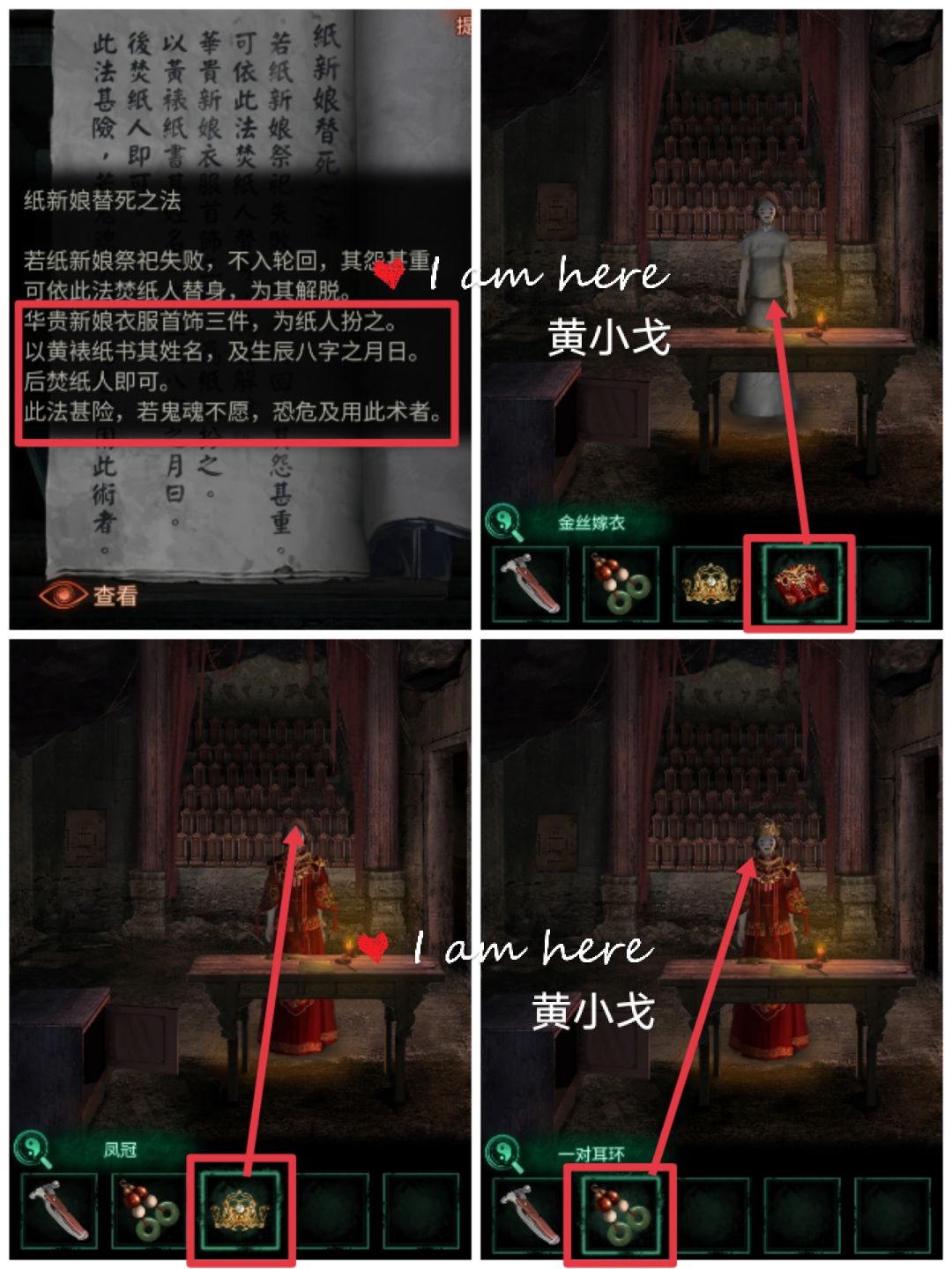 19.(百祭轩)根据《六转妙法录》上的线索,给纸人穿上【金丝嫁衣】、戴上【凤冠】和【一对耳环】