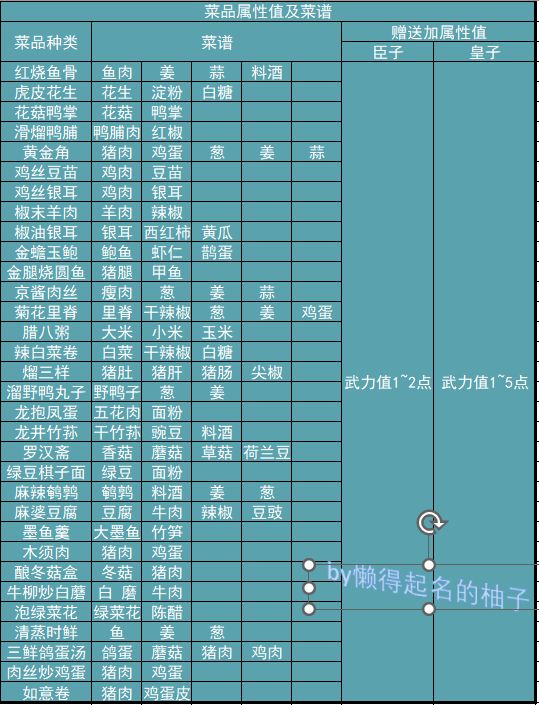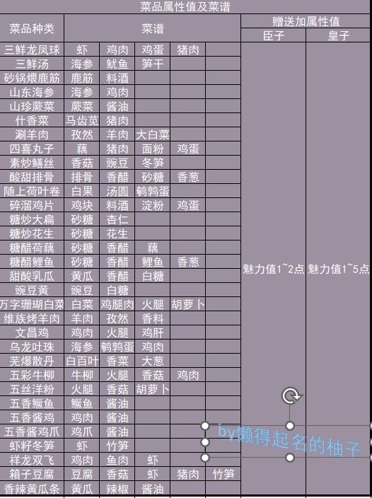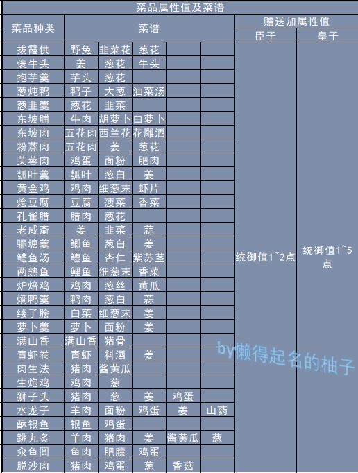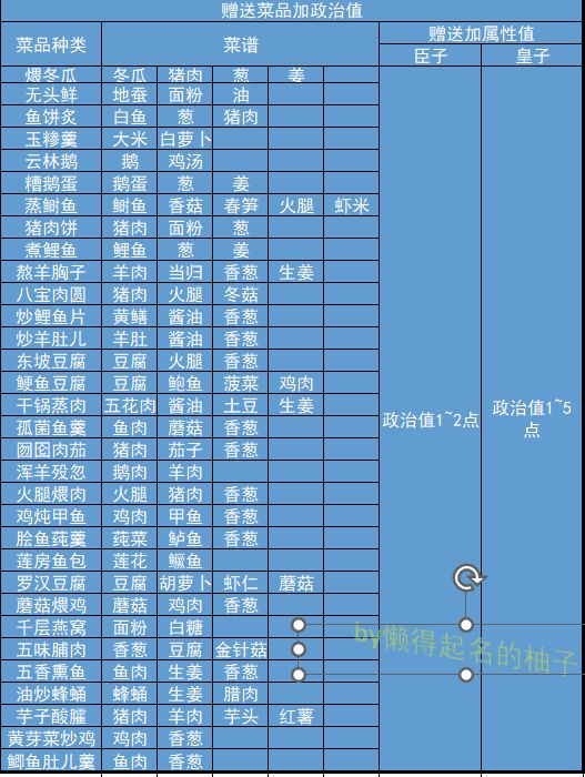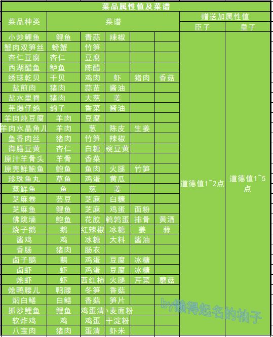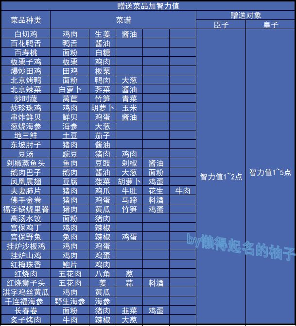 各种菜肴送给大臣都是+2亲密度,+2~6忠诚;送给妃子/皇子+8~12宠爱,降低10~15躁郁值。