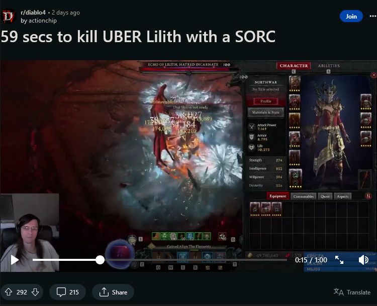 他使用的是法师职业。在 Reddit 上一位用户分享了这位名叫 Northwar 玩家的直播切片。他挑战的难度是世界等级4,59 秒的击杀时长包括了莉莉丝两个阶段之间消失的时间。