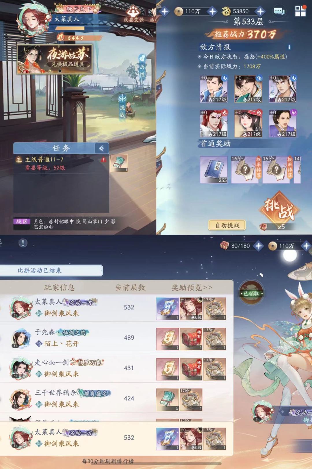 (三)肝度问题。以为这样就能轻松爬到532层?错了,还需要无限的肝肝肝,不断的点击继续挑战、自动爬塔(基本5秒一次速刷,点多了感觉要吐了),我有好几层是点了数百次才通过的……。当然对于超级氪佬搞了N多15星侠客的话请无视……
