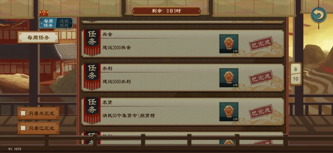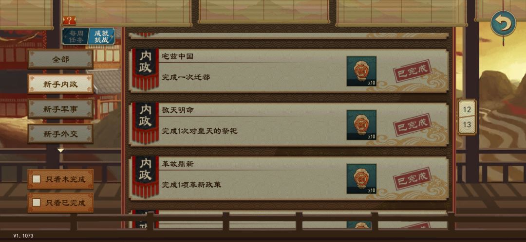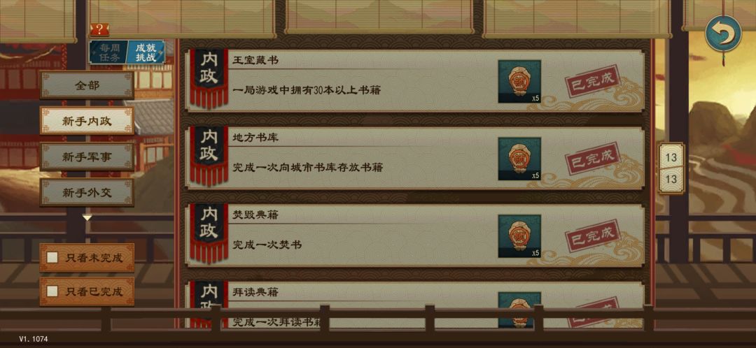 同上,但一个关键问题是司空每年自动加水利(自动加的还不算在成就里),正常玩等统一的时候大部分城邑水利100建满或接近100,开浚河令经常只能普建1点(有水利99的城)。一个解决方案是换一个低智略非农家贤士去当司空,每年全国减个5点水利不愁没开发空间。