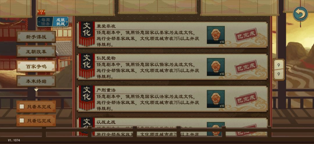 我这9个成就是用同一个统一档刷的,之前在1城阶段基本上点满了所有9个派系200多项政策(后面城多刷政策成本太高),另外带了圣人商鞅。在达成统一条件后劝进之前存个档,每次读档后先切换成想刷的派系,由于政策之前就基本刷好了因此稍微补几个就能实现派系政策点完,然后坐等商鞅触发全国洗文化事件直接100%顺流,劝进达成成就。