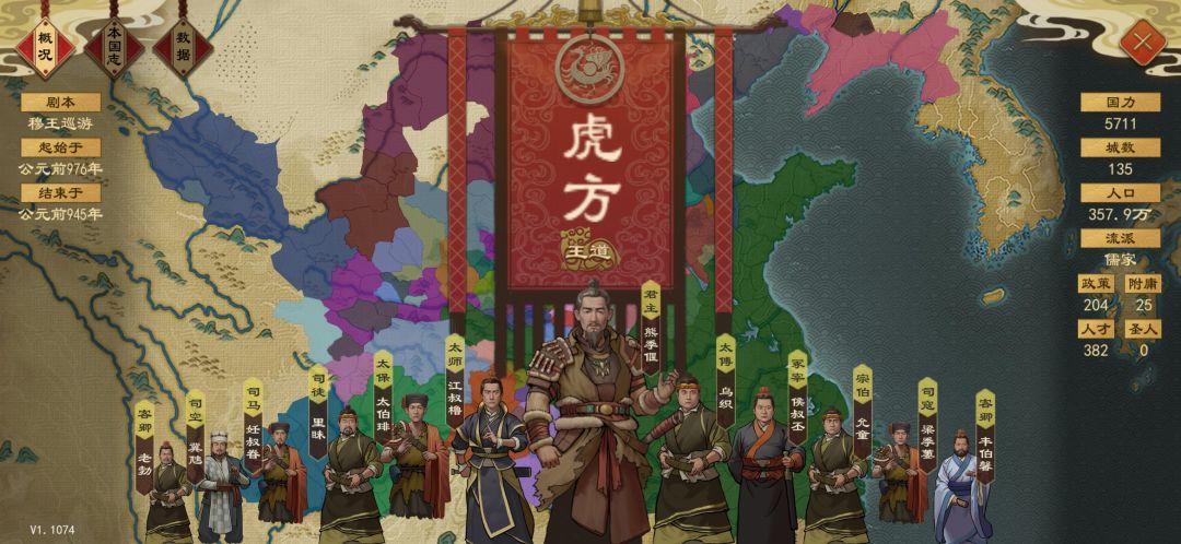 由于开局是周朝诸侯没法让同王朝国家灭国,因此上来建议宣战扬越然后求和称臣纳贡,这样就不是王朝国家了(过几年独立值够了可以“自立为王”再宣扬越称王打的舒服一点,不称王也不影响)。出王朝后建议用“兼并土地”宣战名分一路推上去就好。