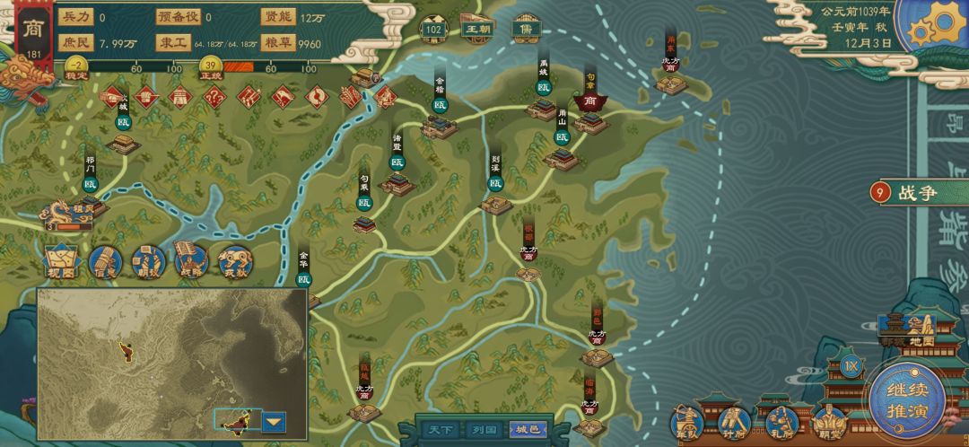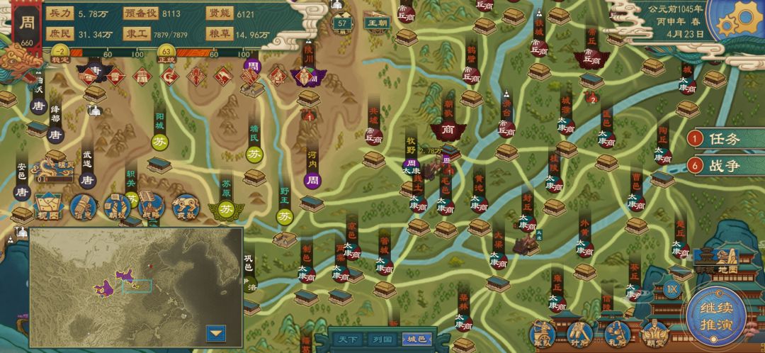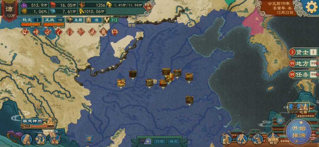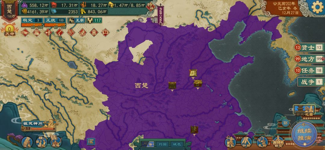 区域占领任务,上来先查看先需要占领的区域。开局自带孙膑兵不厌诈军事实力碾压,我的思路是先打楚,拿下东海淮泗水区域相关城邑,顺手把宋和东海两国的几个城也占了。和楚停战后应该到达64城了,立刻顶着休战期合纵楚,以防自己被合纵,然后统一四海宣燕赵完成任务。其中需要的注意一点第一年粮大概率不够,本来军队就多外加君主和孙膑自带技能有额外粮饷,如果没有发生大规模火并,考虑提高税率或退役一部分军队转化为人口。