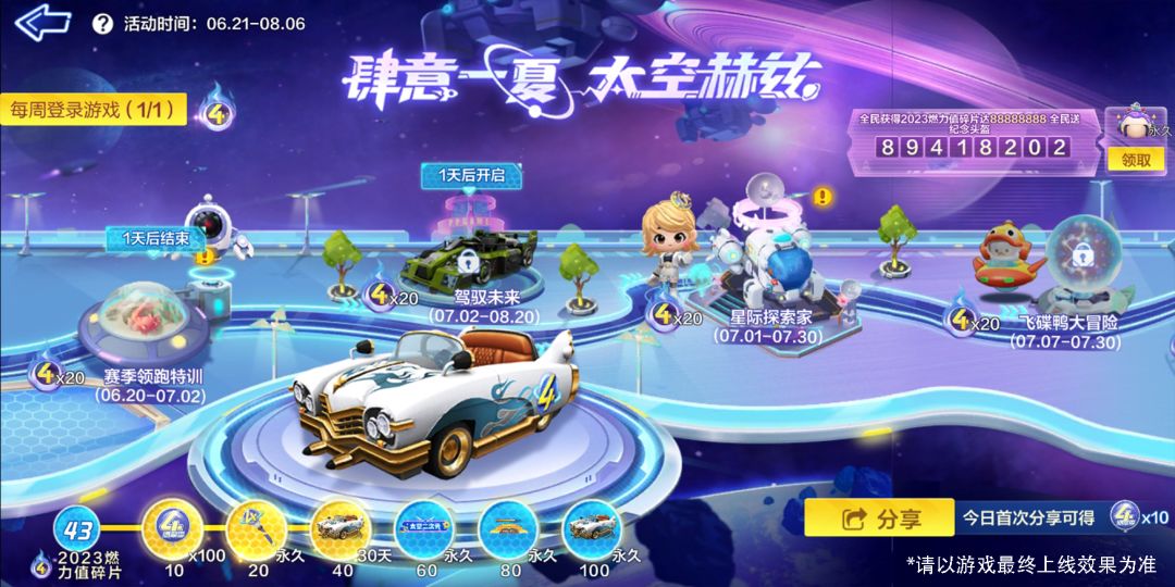 周年生日季,燃擎献礼,八大惊喜陆续上线,助力车友们玩转繁荣山丘!全新赛车、全新周年套装、超萌太空主题宠物&飞宠,敬请期待!
