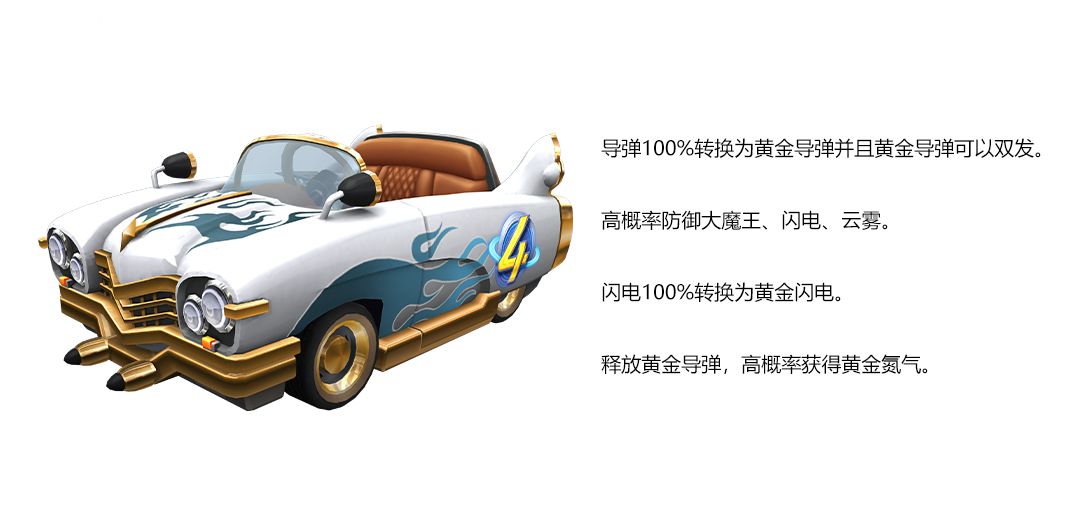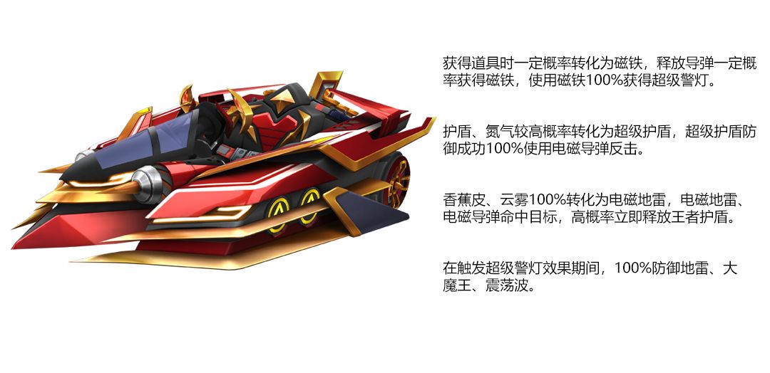 3.香蕉皮、云雾100%转化为电磁地雷,电磁地雷、电磁导弹命中目标,高概率立即释放王者护盾。