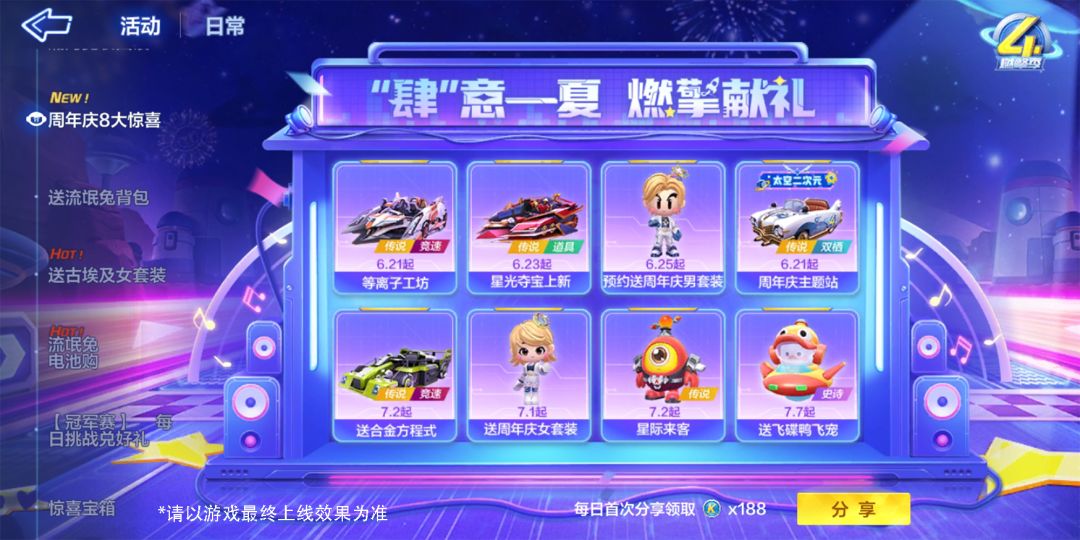 2023周年燃擎盛典即将来临,肆意一“夏” 主题站率先开启,集燃力值领取超丰厚周年奖励!全新纪念赛车【白金威豪纪念版】、周年专属配饰等,一网打尽!