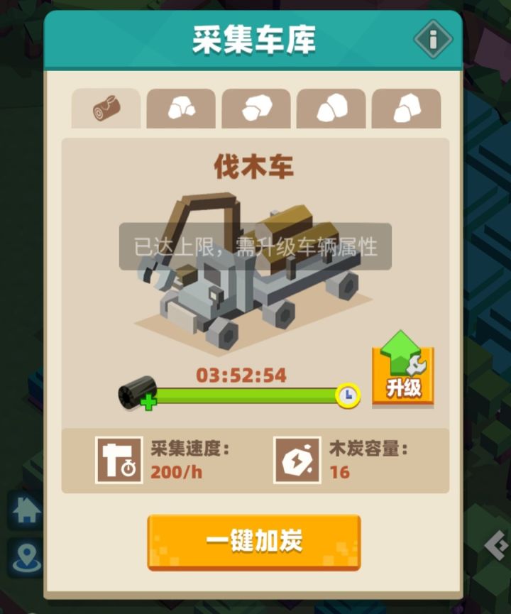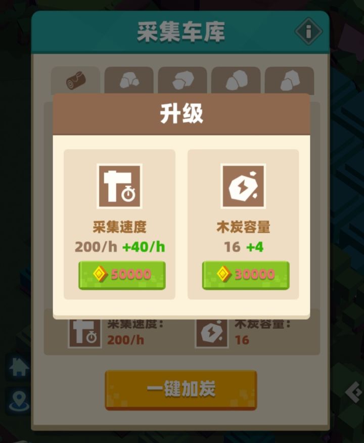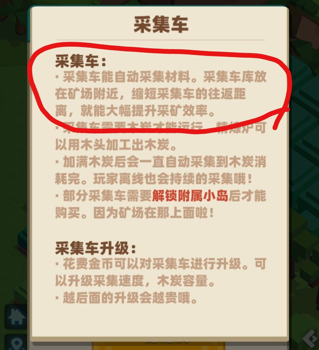 有些人不是很清楚这些采集规则,要么是觉得采集车库放哪都一样,要么是听说只要放在矿场附近就可以加快采集速度,自己缺金,就想把它放在金矿旁边(哈哈!好像没有金矿铁矿,只有铜矿石矿木材厂),如果升级的采集速度只有20/小时,那单个采集时间是180秒,这时车库放旁边,小矿车也要等180秒生产好才能送到车库里,所以没必要放旁边,180秒够小矿车在家里任意位置跑了。