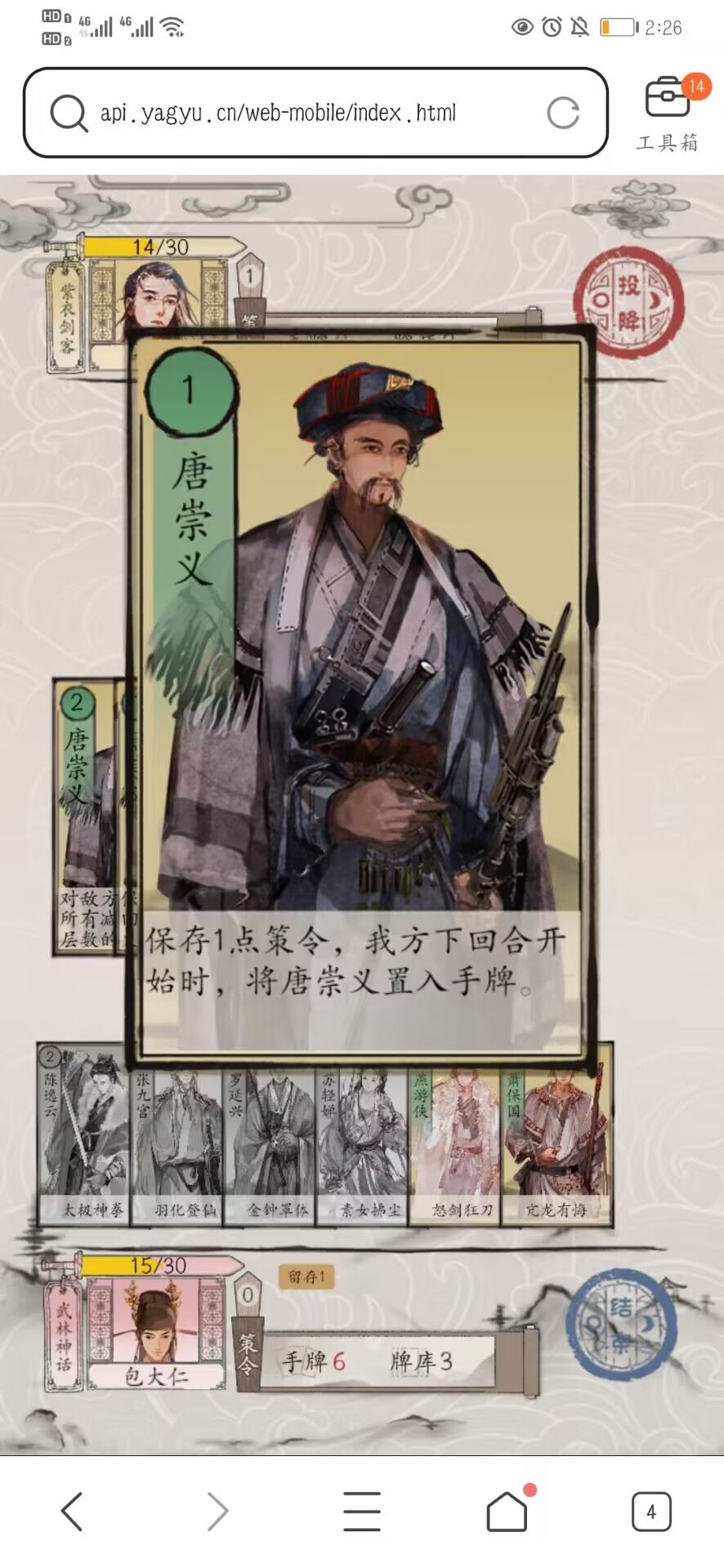 根据老玩家对武林机制过于单一的反馈,对萧保国、唐崇义进行调整,加入透支策令和留存策令的新机制。同时,唐崇义升至金卡。