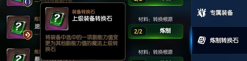 炼制转换石时,可根据需求选择套装,当品质级别达到最上级时,保证可选择转换石的能力值类型。用作炼制材料的[转换根源]数量越多,得到的转换石品质级别越高。