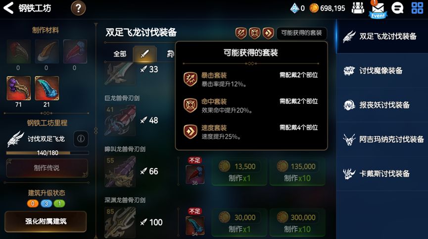 消耗讨伐时获得的材料,可获得讨伐装备。各个讨伐可获得的材料不同,装备套装效果也不同,因此为了取得想要的套装装备,请参考制作类别里的可获得的套装。不要制作75级以下的装备,可通过炼金塔将低品质装备转化为高品质装备再制作。