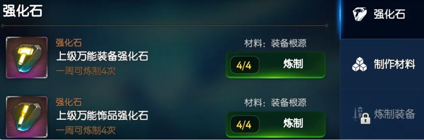 可使用装备根源材料炼制强化石。所使用的根源材料数量越多,品质级别越高。而品质级别越高,炼制而成的强化石数量越多。