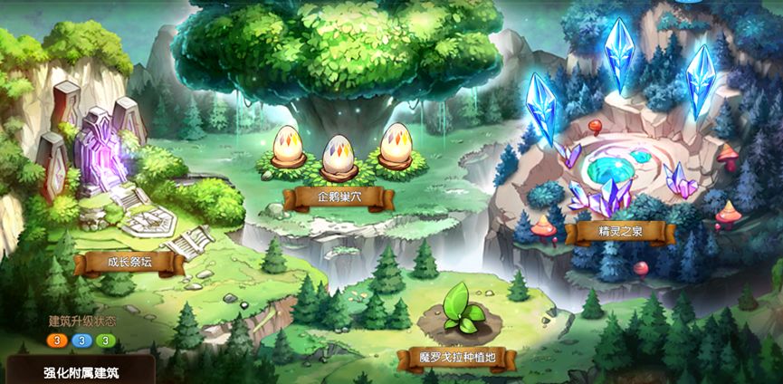 [精灵之森]是可培育企鹅、精灵之花、魔罗戈拉等英雄成长所需材料的地方。可通过强化附属建筑提升效果