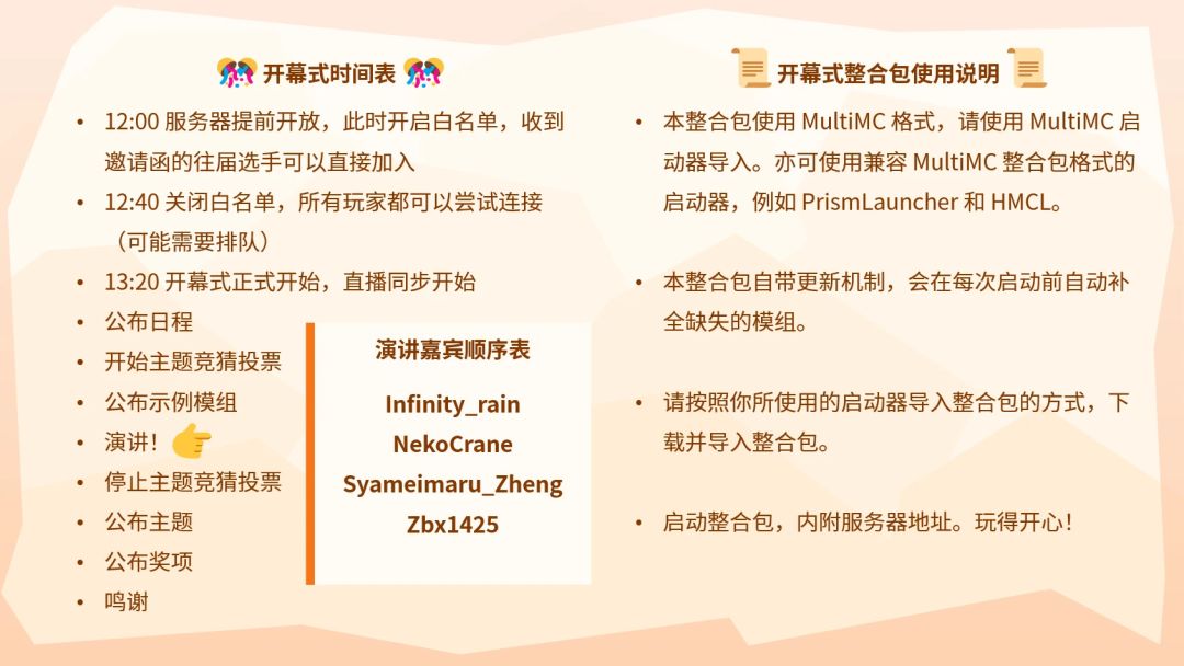 本届开幕式基于 Minecraft 1.20.1,经历(或者没经历过)往届数次开幕式「喜报」的非常热心玩家,可以下载本届开幕式的整合包,来和我们的服务器斗智斗勇