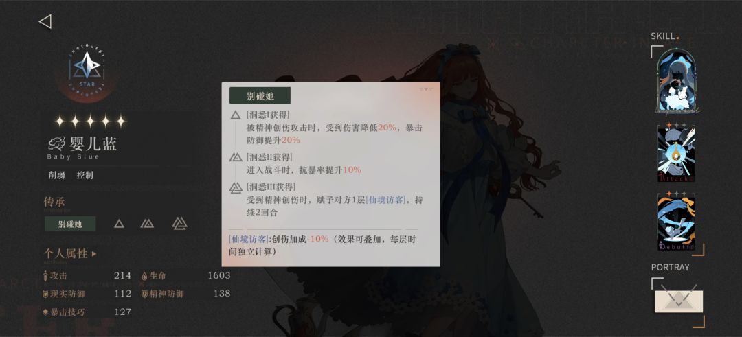 ①前言:婴儿蓝是星灵感精神特化辅助,她在精神队中的地位等同于柏林以东在现实队中的地位,不过和柏林以东做对比也是各有优劣,她的优点是在应对精神创伤敌人时生存能力极强、神秘术附带敌方伤害削减可以提升队伍生存能力、群体控制可以打断敌方关键技能,缺点是神秘术一“过家家”二阶以上才有附加精神减抗会导致比较依赖出手次数、自身伤害较低不能担任队内副输出。目前1.1上半版本角色池她是无可替代的第一精神特化辅助。