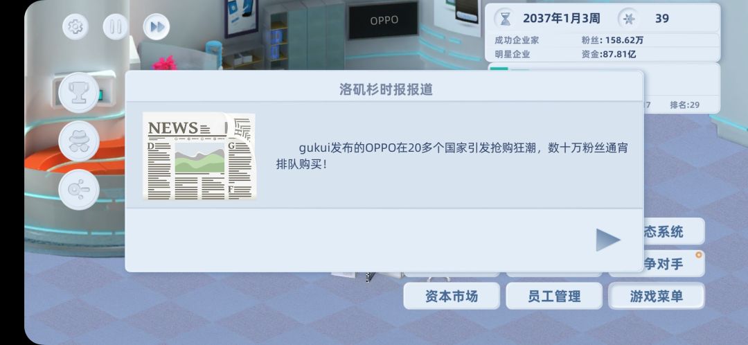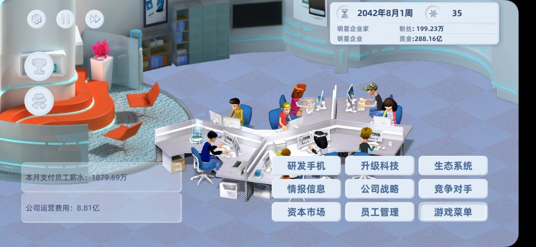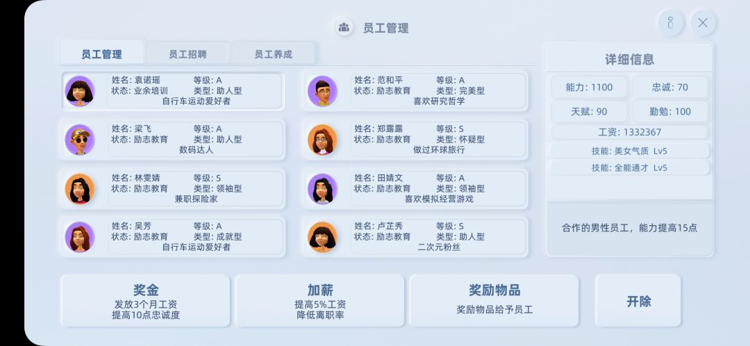 员工前期先使用D级,每回合都去看一下招聘市场,看看那些属性高并且便宜的就换下来,这样前期能帮你省下不少钱,后期直接全部换A级,因为我走的是豪华市场,如果走的是中期市场可以换B级