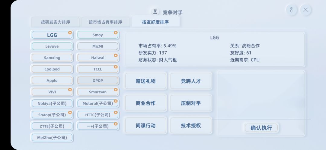 企业:遇到那些厂商,先和那些大厂做好关系,然后用尽策略去对付小厂,大厂关系好了可以派间谍偷取科技,小厂大概一年制裁一次,不过我觉得舆论是最好用的
