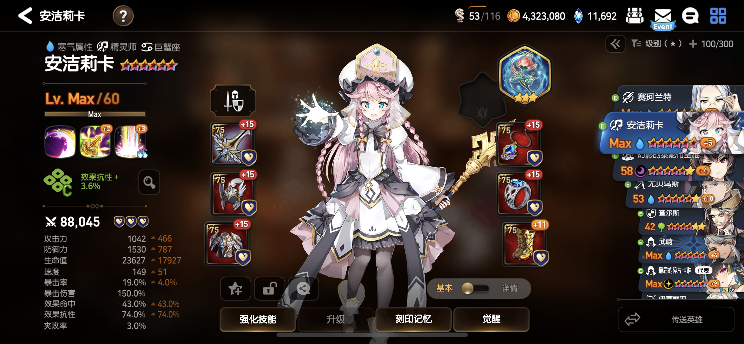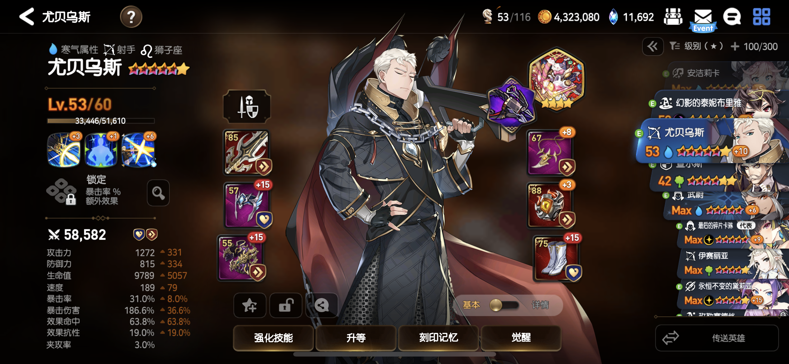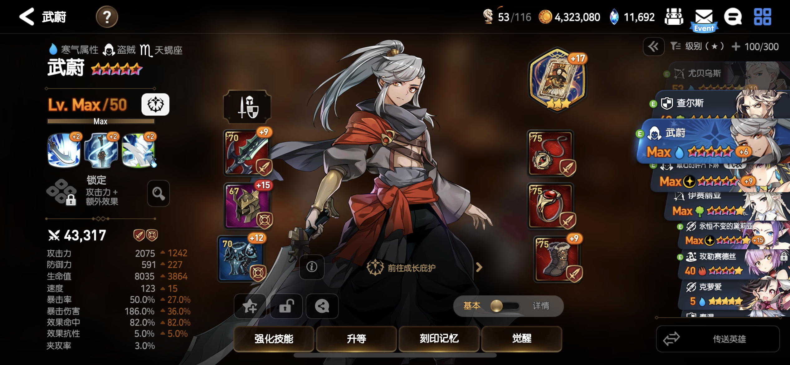 龙13的队伍的一些参考,虽然我的也不算是完全成型,但是面板的方向可以给大家参考,特别是没有星辰的玩家的一些参考。首先赛珂兰特(旧水镰)最重要的需要堆高的攻击和暴伤,不需要命中,暴击因为有开水哥只要65%左右就可以。尤贝乌斯(开水哥)主要就是一工具人(5星5觉就可以,我是自己手贱,不小心升了6星),重点是要堆高速度和命中,速度到160-165其实就可以了,另外就是命中。没有星辰这个神器的最起码保证命中不低于65%,最好85%。然后是武蔚一个工具人,也是优先堆高命中,最好在85%,最低65%。其他就是暴伤。最后是水奶,水奶建议血量一定要高,对于防御也有一定要求,6个血套应该差不多了,一般保持2.3w血,1500左右的防御,基本不会死。神器选择加防御,或者防护套的都可以。减cd的神器一般。然后就是水奶放前排,其他角色随意,我一般是镰刀放后排,开水哥下排,武蔚上排。