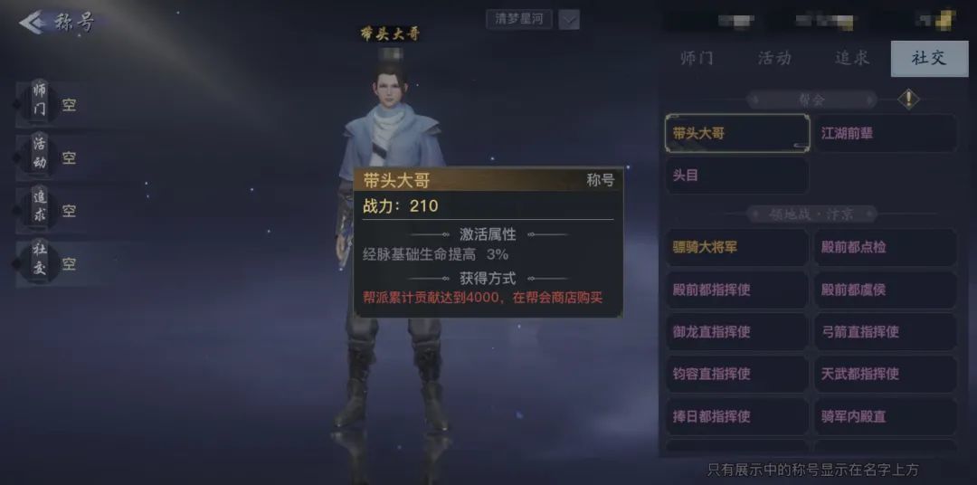 社交称号主要从帮会玩法中获得,或者从帮会领地战中获得。每个领地都会有各种不同品质的称号,等级越高的领地奖励,其称号品质和数量都越高越多。这些称号的属性有很大的不同,比如增加身法、力量、内功等等,需要帮主根据帮众不同的门派流派来分配。顶级的社交称号,可以给少侠增加非常强力的属性和高战力。