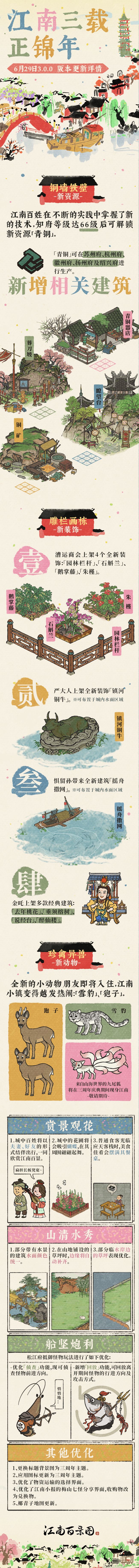 江南百景图三周年新版本将于6月29日上线,有关3.0.0三周年版本中诸多全新内容已汇总到下方长图,还请知府大人们查看。
