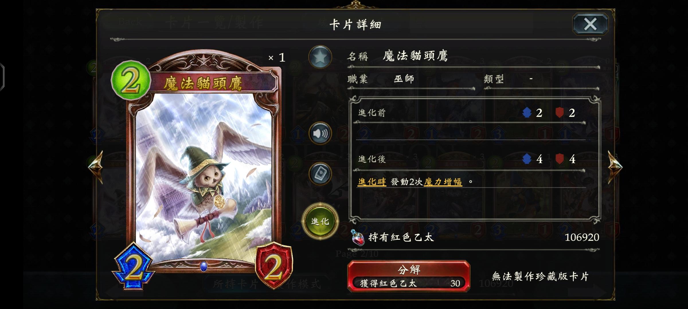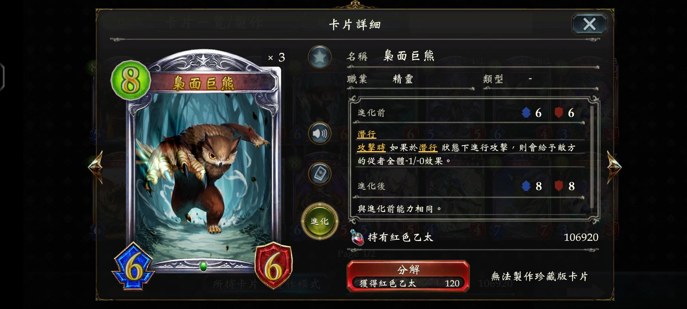 回合结束时,这场战斗中自己随从进化次数为10以上时,随机破坏对手3个随从,给予对方主战者6点伤害,回复自己主战者6点生命,自己所有手牌费用-3。