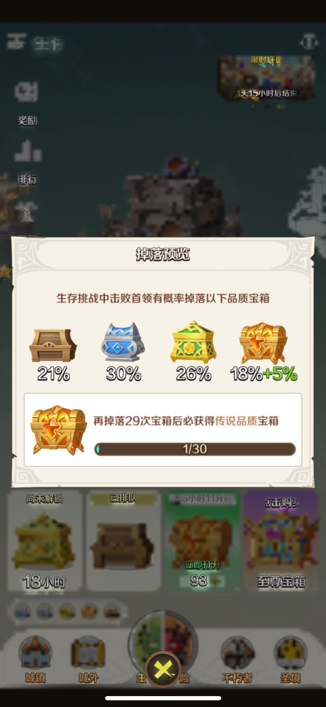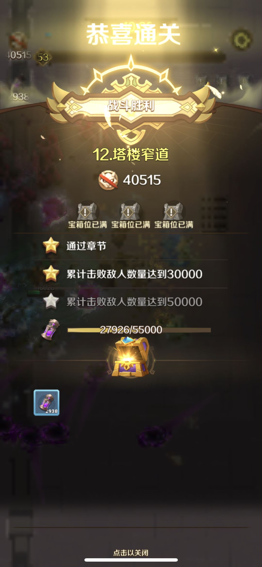 打到低级的箱子就结束战斗,刷高级的箱子(概率会随关卡提升)[图片8];另外因为偶发幸运事件当满次数必的高级箱子的时候,尽量让宝箱队列多留一个位置,说不定传说箱子能幸运多加一个;还有就是钥匙留着10个再开,单次开绿装那是别人家的宝箱。。。