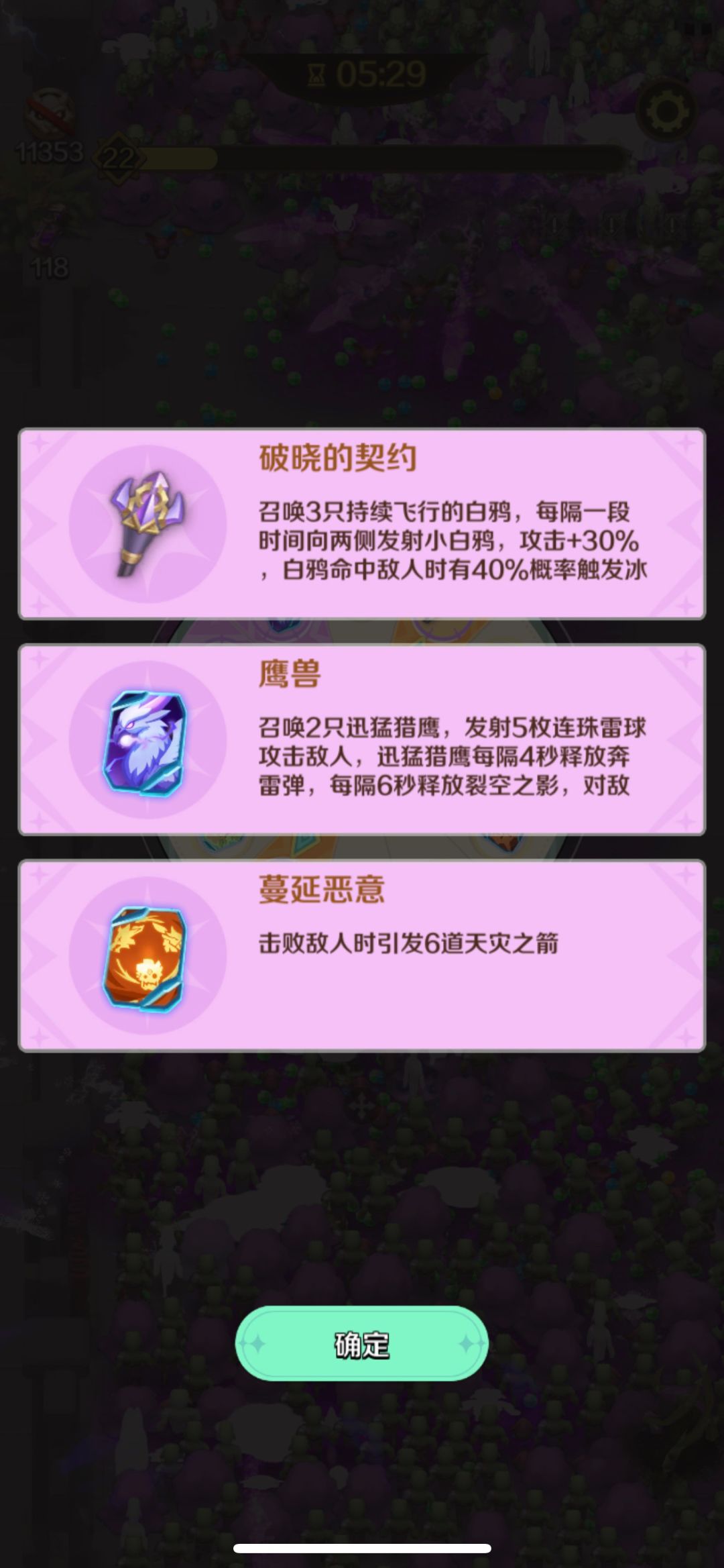我主要玩德鲁伊,主玩鸭杖、鹰、树精、毒蒺藜、恶意蔓延;因为鹰的觉醒属性印记为[提升经验值加成],树精的觉醒属性印记为[提升会心几率],这类属性印记就算随机拿到或者三选一无牌可选时升级也不会纠结(可以把经验值加成看作是提升圣灵牌等级的戒指、会心几率加成当作倍伤的戒指);而鸭杖、毒蒺藜、蔓延恶意、这类都是全屏甚至超屏幕外的大范围伤害;