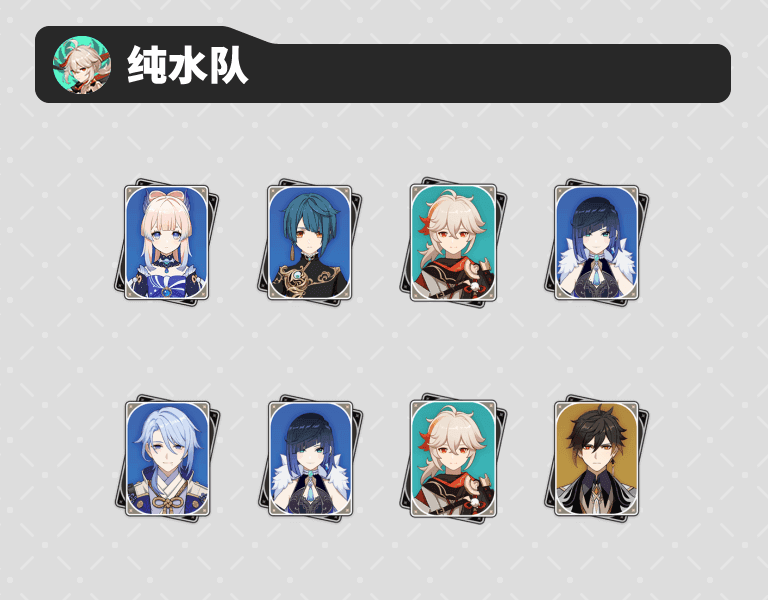 水队、火队则都是纯色队,依靠纯色互相吃增益buff,互相充能(简称互充互拐),代表队伍则是心海三水和可莉三火。