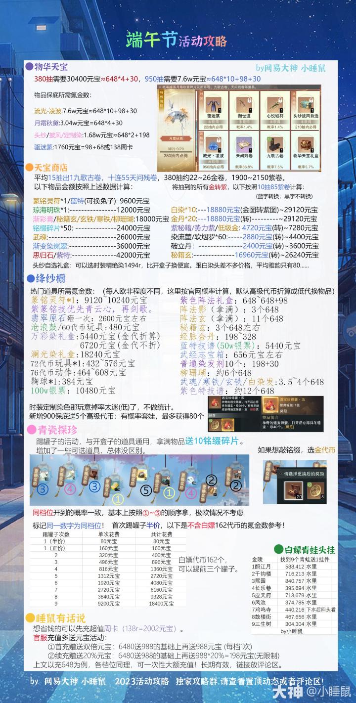 端午节活动攻略,物华天宝、天宝商城、万彩染、澜光染、白嫖青蛙挂件点位、青瓷探珍、绛纱橱攻略来了~新增时装定制染色,白嫖的挂件记得一定拿