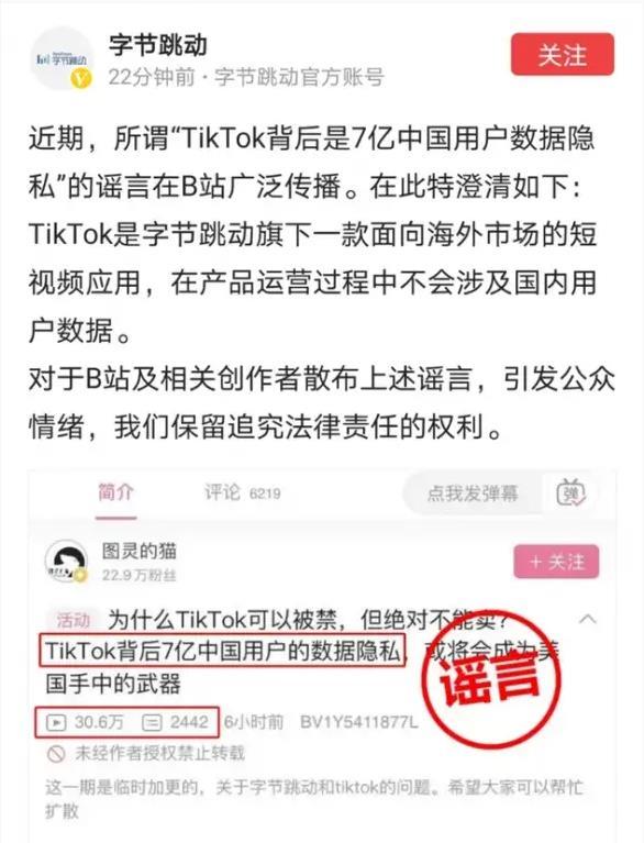 1、字节跳动官方账号发布声明称,对于近期在B站平台广泛流传的“TikTok背后是7亿中国用户数据隐私”谣言,字节跳动将对B站及相关创作者保留追究法律责任的权利。在声明中字节跳动表示:“TikTok是字节跳动旗下一款面向海外市场的短视频应用,在产品运营过程中不会涉及国内用户数据。”
