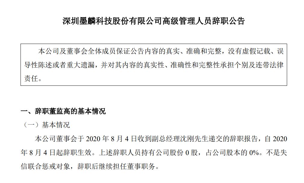 此外,深圳墨麟科技股份有限公司发布公告称,公司副总理沈刚已递交辞职报告,辞职正式于8月4日起生效。