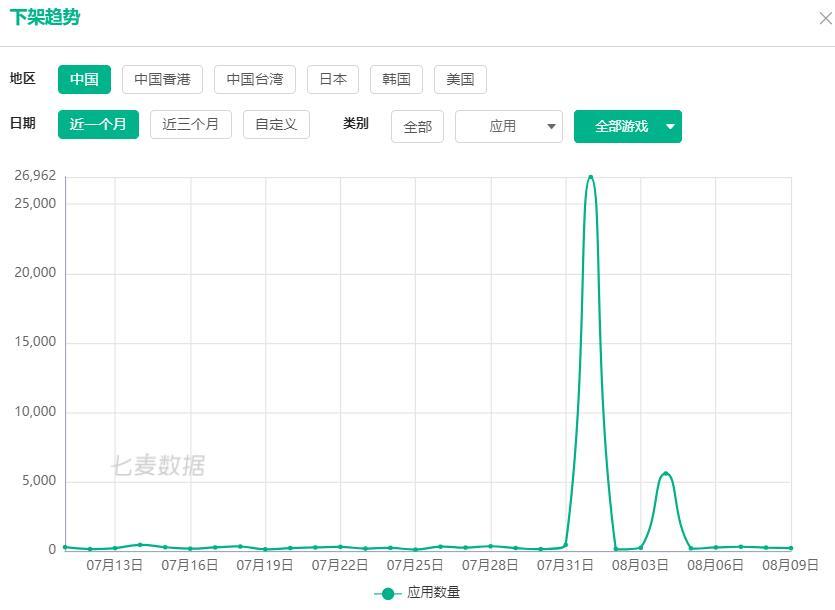 与此同时,App Store的严查版号制度也执行了一周有余。据七麦数据监测,自8月1日新政正式实施至今,共有近34000款游戏被下架,其中8月1日下架近27000款,8月4日的单日下架数量为5589款。在下架游戏中,绝大部分为海外游戏。