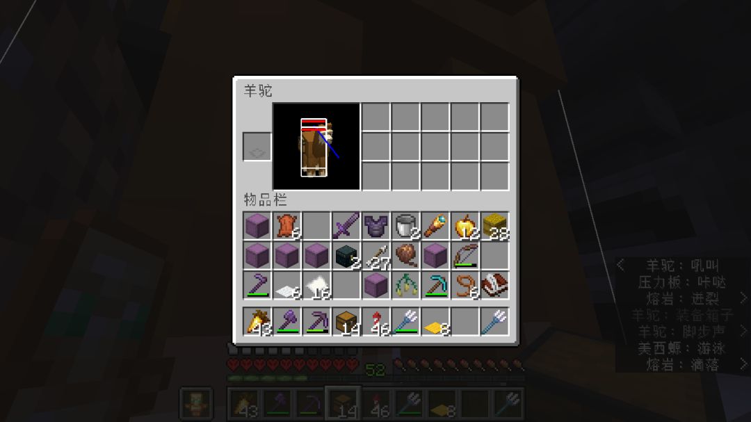 而且1.20新增骆驼,两个人骑在骆驼上,每个人再牵3队由8只羊驼组成的驼队,每只羊驼背包在15个潜影盒,每个潜影盒再塞满可堆叠的物品,这不妥妥的移动全物品?