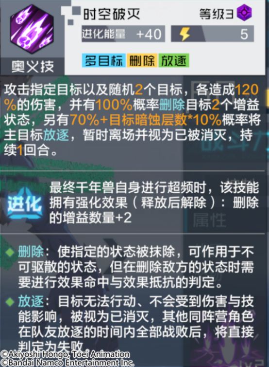 最终千年兽是具有特殊控制能力的暗属性数码宝贝。奥义技是攻击指定目标与随机两个目标,删除其2个增益状态后以较高的概率将主目标放逐,目标的暗蚀层数越高则被放逐的概率越高。得意技是对敌方全体造成自身攻击力一定比例的真实伤害后,删除目标数个增益。被动是自身生命值不低于50%时,自身行动结束后将为我方攻击力最高的目标赋予护盾;自身每次受击时有100%概率为目标赋予暗蚀标记。若最终千年兽被敌方击败,则会将击倒自身的目标放逐,该效果有数回合的冷却时间。删除为新增效果,类似于驱散,但可以作用于不可驱散的状态,与驱散不同的是,删除敌方状态时需要进行效果命中与效果抵抗的计算。