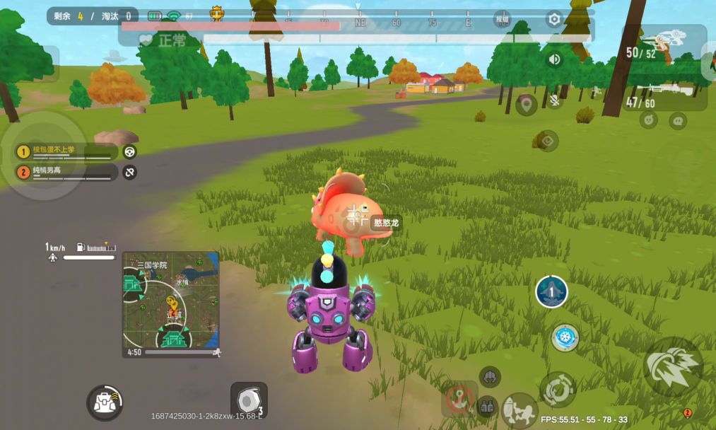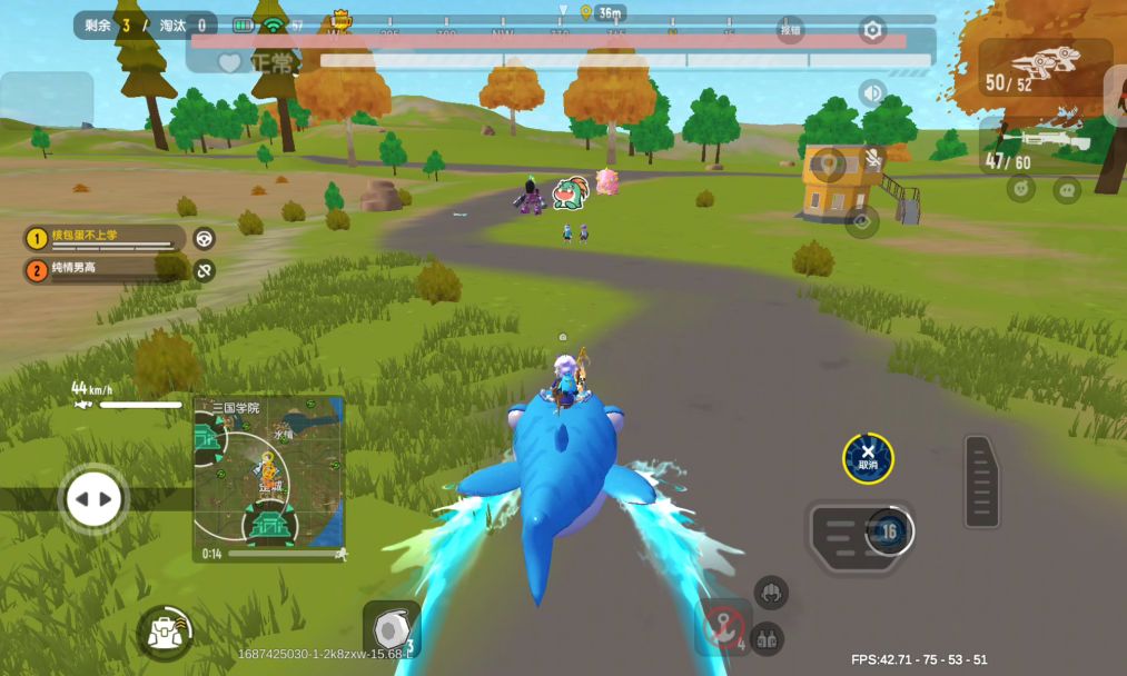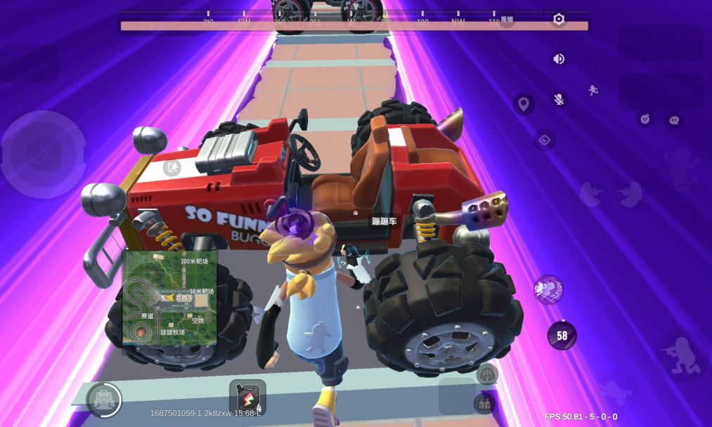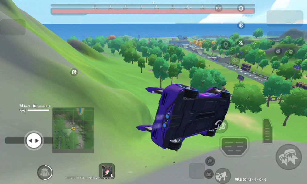飞车是摇车赶路的首选载具之一,因为飞车的基础速度(100km/h左右)在所有载具中遥遥领先,但开启飞翔技能后速度反而降低至60km/h左右,极不利于追击或者赶路,但很多岛民都存在一个误区,喜欢在一些山坡顶上开启飞翔技能,速度大大降低且拐弯不灵活,遇到实力稍为强劲的对手就很容易被打下来。其实我们可以把飞翔技能当做一个车位矫正,比如在一个山丘上飞跃下来落地即将翻车时点击飞翔技能,即可做到快速矫正车位,避免翻车时被敌人集中火力淘汰: