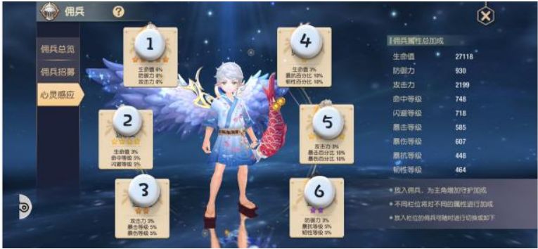 心灵感应有 6 个位置,每个位置将直接转换佣兵属性的百分比到人物身上