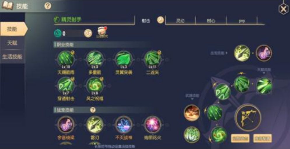二连矢:单体两段伤害技能,射击灵动天赋都可佩戴。