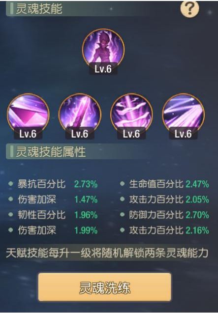 对 于 灵 魂 技 能 属 性 不 满 意 , 可 点 击 下 面 的 灵 魂 洗 练 , 消 耗 一 个 精
