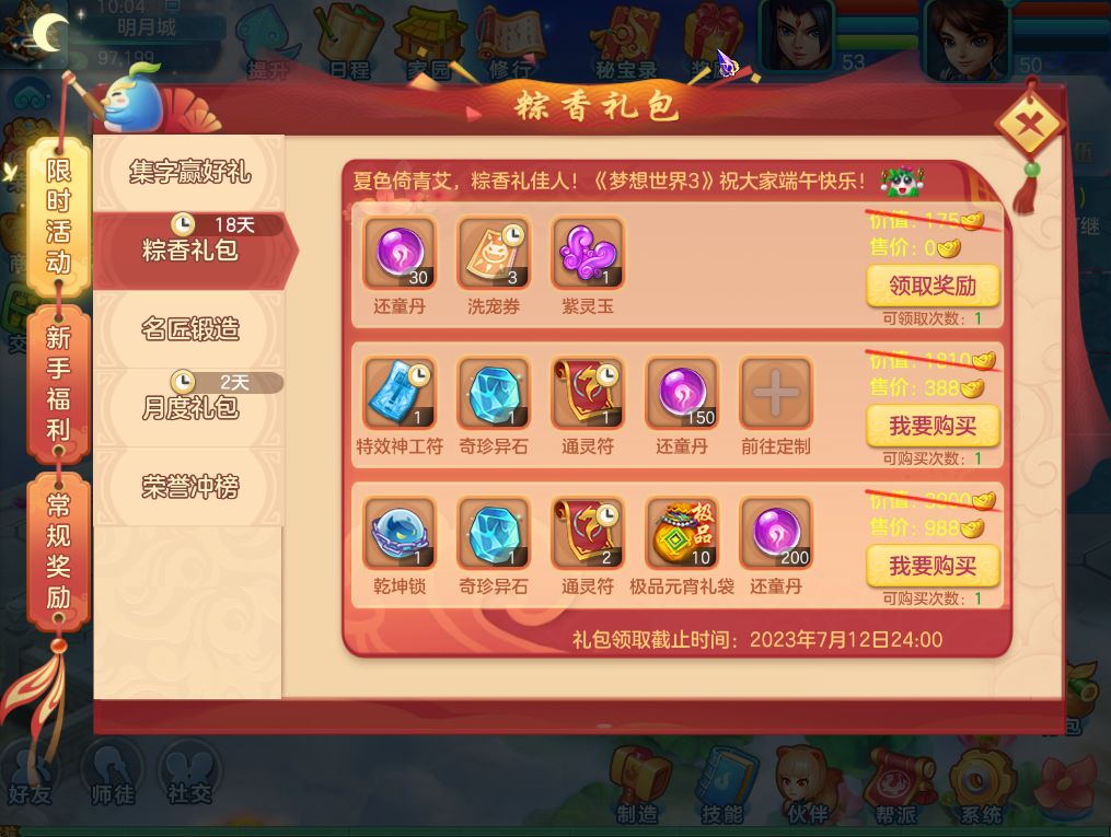 1)6月22日维护后-7月12日24:00,服务器等级≥55级的服务器玩家可前往奖励界面领取粽香礼包;