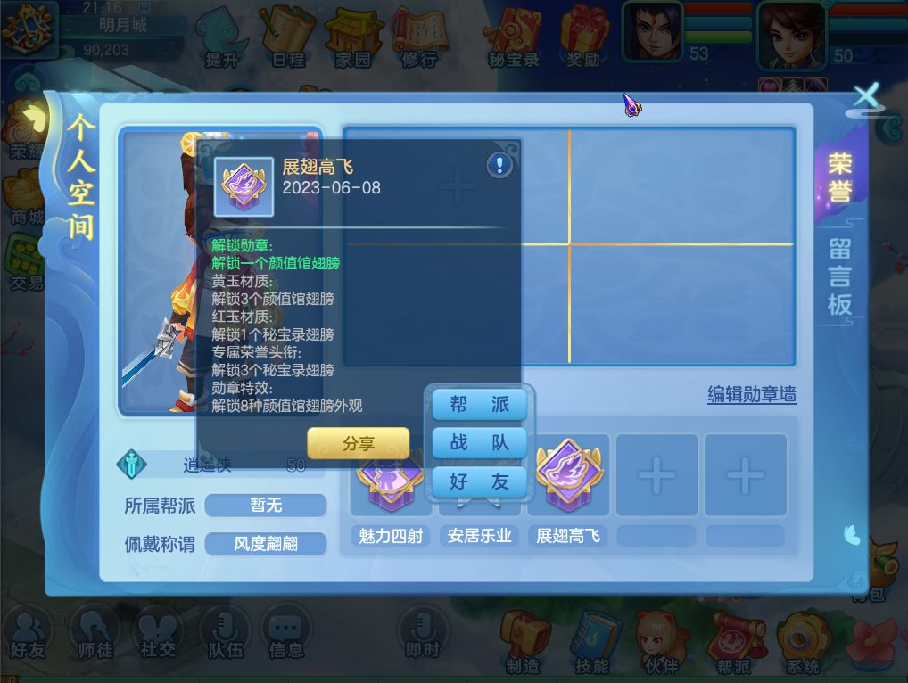 ①新增勋章、头衔的分享功能,点击“+”号在荣耀、称谓可分别查看和分享勋章、荣誉头衔;